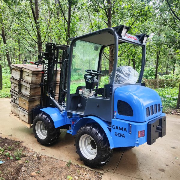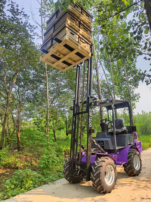 Aanpasbare gelede heftruck met een hefvermogen van 1500 kg voor het hanteren van bijenkorven in de bijenteelt.